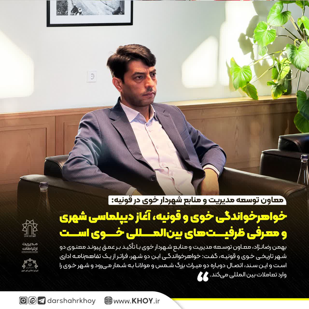 بهمن رضانژاد، معاون توسعه مدیریت و منابع شهردار خوی با تأکید بر عمق پیوند معنوی دو شهر تاریخی خوی و قونیه، گفت: خواهرخواندگی این دو شهر، فراتر از یک تفاهمنامه اداری است و این سند، اتصال دوباره دو میراث بزرگ شمس و مولانا به شمار میرود و شهر خوی را وارد تعاملات بین المللی میکند.
