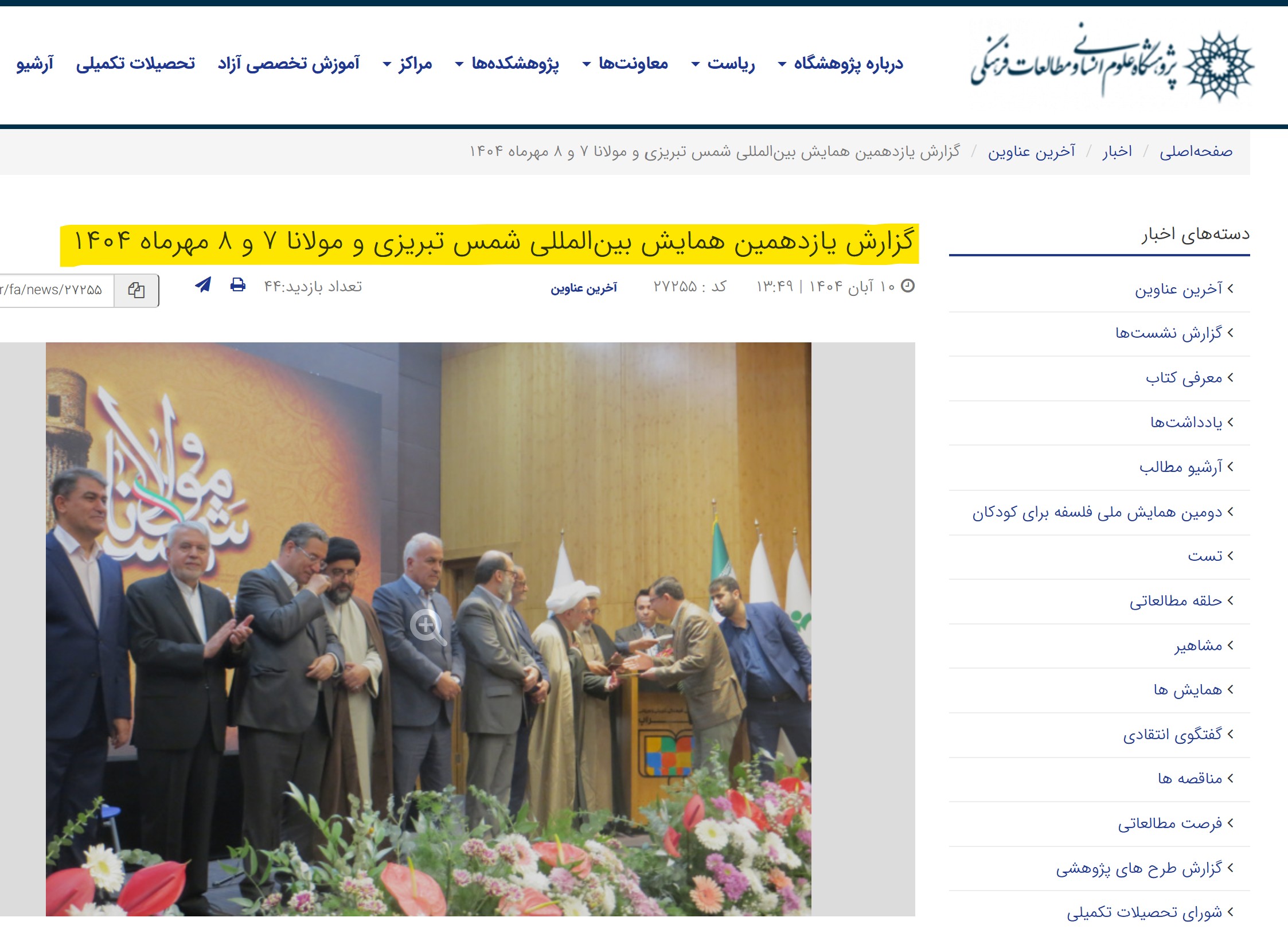 پژوهشگاه علوم انسانی و مطالعات فرهنگی و موسسه تولیت شمس تبریزی و مفاخر، به عنوان سکان دار بازآفرینی هویت میراث های فرهنگی تمدنی ایرانی – اسلامی، خدای را شاکر است که در فرایند همکاریهای همدلانه و موفق با همه نهادهای دست اندر کار با اهتمام مستمر در برگزاری همایش بین المللی شمس تبریزی و مولانا در بیش از یازده سال اخیر، به جهانیان و نسل های آینده ایران روشنتر ساخت که این مرز و بوم دارای چنین گنجینههایی است و زبان و ادبی فارسی که رودکی، فردوسی، غزالی، خرقانی، بایزید، نجم الدین کبری، نظامی، ناصر خسرو، عطار، مولوی، سعدی، جامی، ملک الشعرا بهار و امثال آنان را در خود پرورانده است، می تواند عامل تلطیف روانی و آرامش جان آدمی در دنیای کنونی و تسکین آلام و رنجهای بشر امروز باشد.