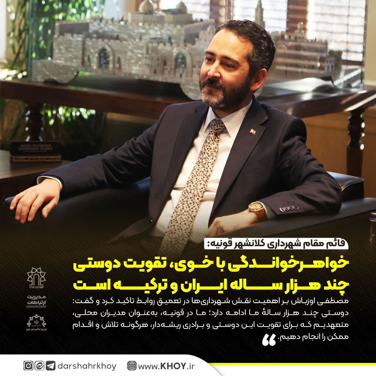 به گزارش اداره ارتباطات شورای اسلامی شهر و شهرداری خوی، در راستای تقویت مناسبات فرهنگی و محلی میان دو کشور، هیئت شهرداری خوی ایران با استقبال رسمی مصطفی اوزباش، قائلم مقام شهرداری کلانشهر قونیه، در ساختمان مرکزی شهرداری قونیه دیدار و پروتکل خواهرخواندگی میان دو شهر را به امضا رساندند.
